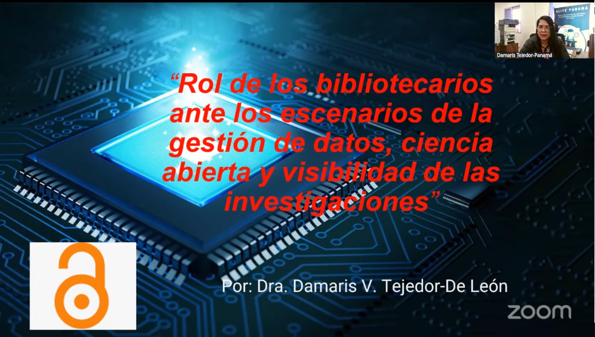 La actividad contó con la participación de destacados ponentes internacionales, entre ellos la doctora Damaris Tejedor de León, coordinadora de Normas y Publicaciones de la Oficina de Publicaciones Académicas y de Posgrado de la Dirección de Investigación y Posgrado de la Universidad de Panamá, quien impartió la conferencia “El rol de los bibliotecarios ante los escenarios de la gestión de datos, la ciencia abierta y la visibilidad de los investigadores”.