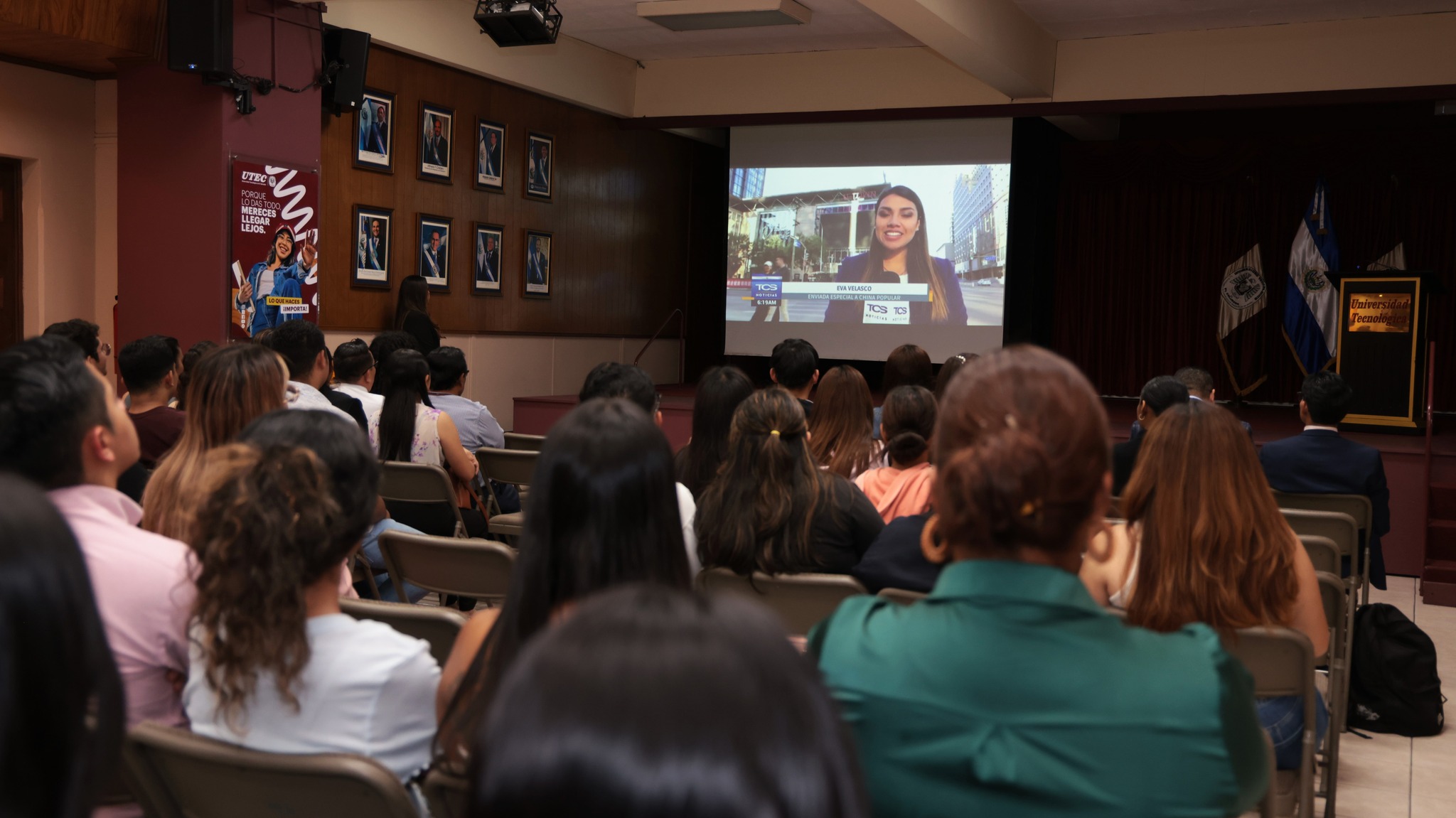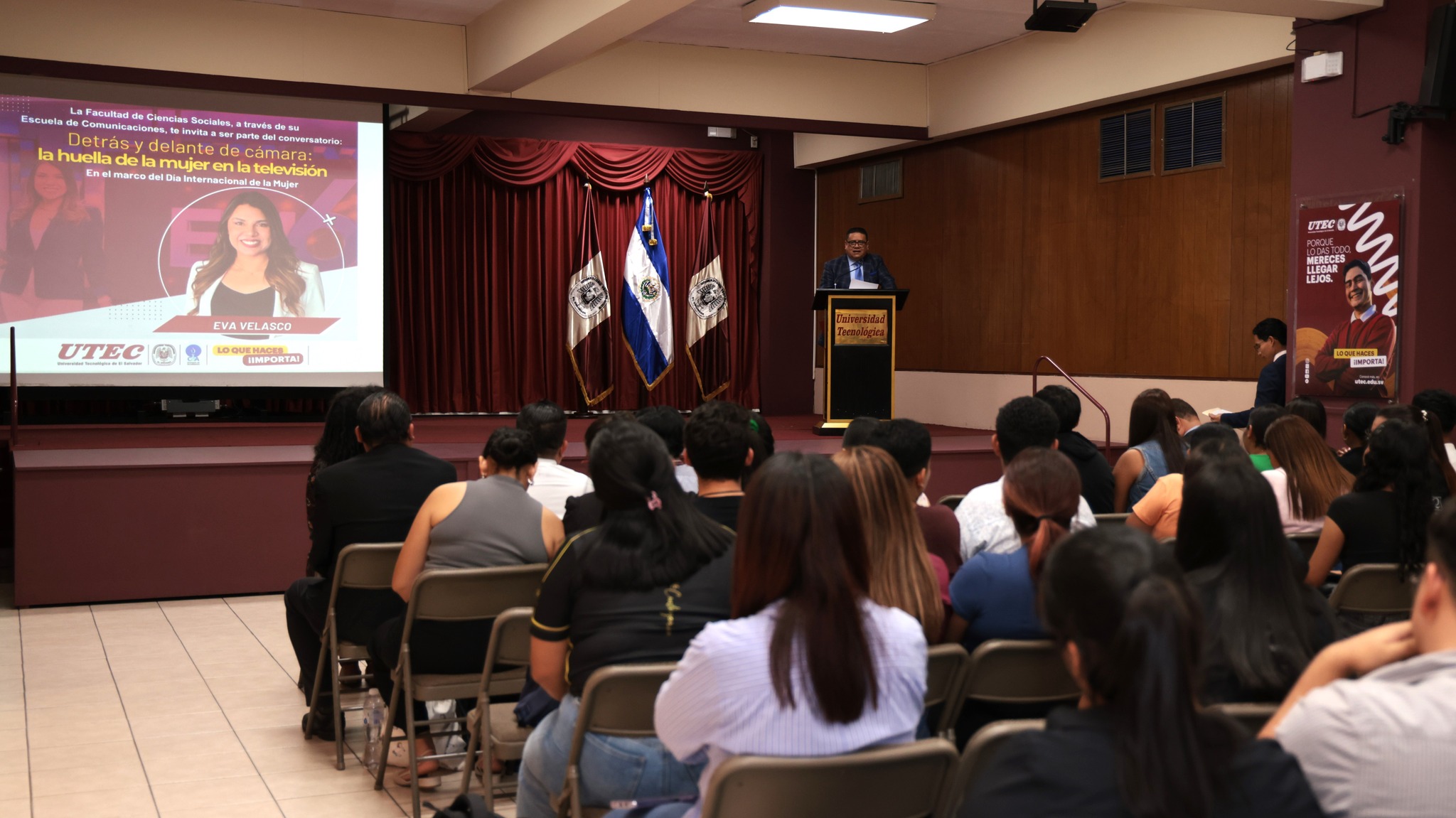 En el marco del Día Internacional de la Mujer, la UTEC, a través de su Escuela de Comunicaciones, realizó el conversatorio “Detrás y delante de la cámara: la huella de la mujer en la televisión”, a cargo de la licenciada Eva Velasco, Jefa de Prensa de Noticias 4 Visión y presentadora de El Noticiero, Canal 6, de Telecorporación Salvadoreña (TCS).