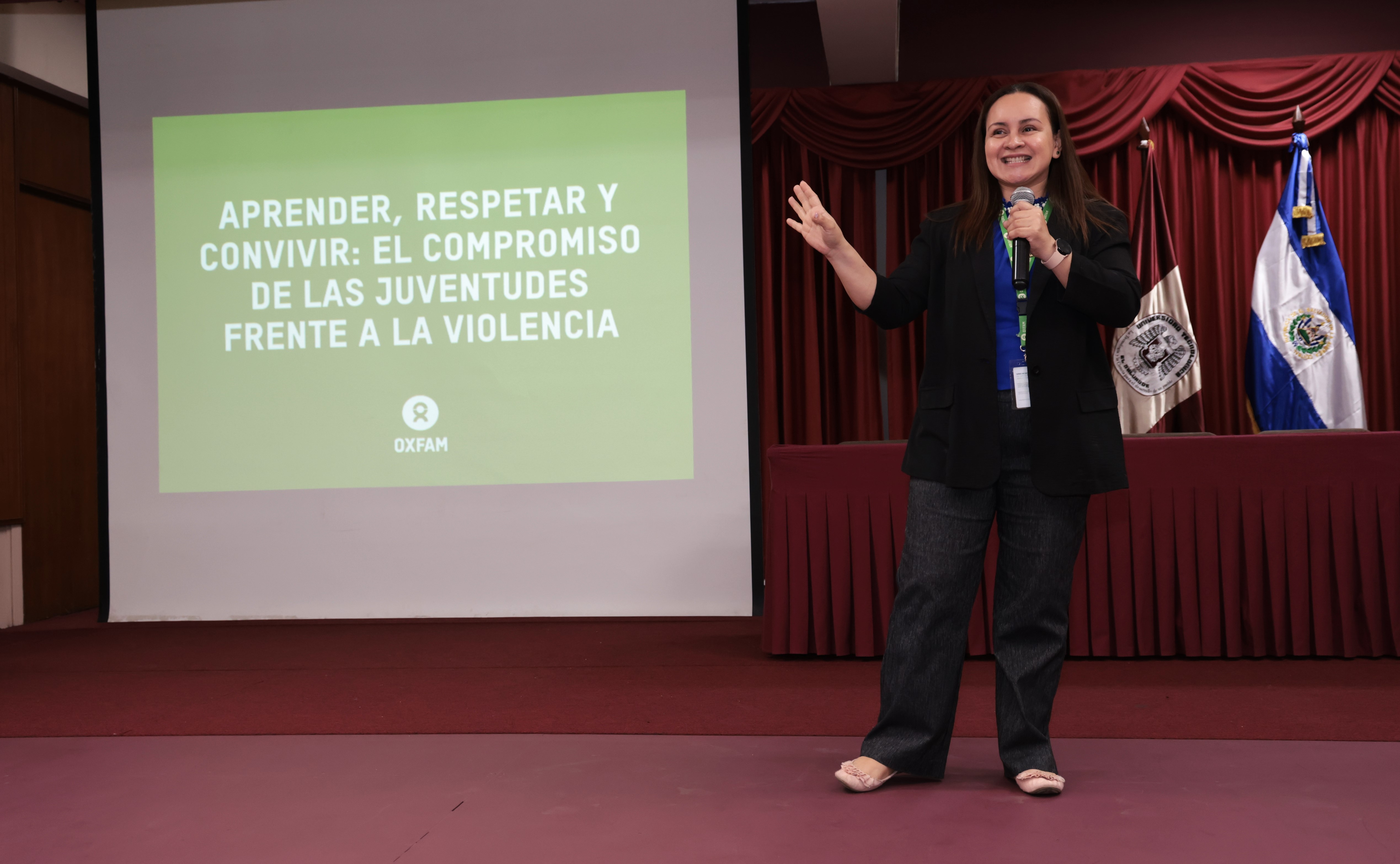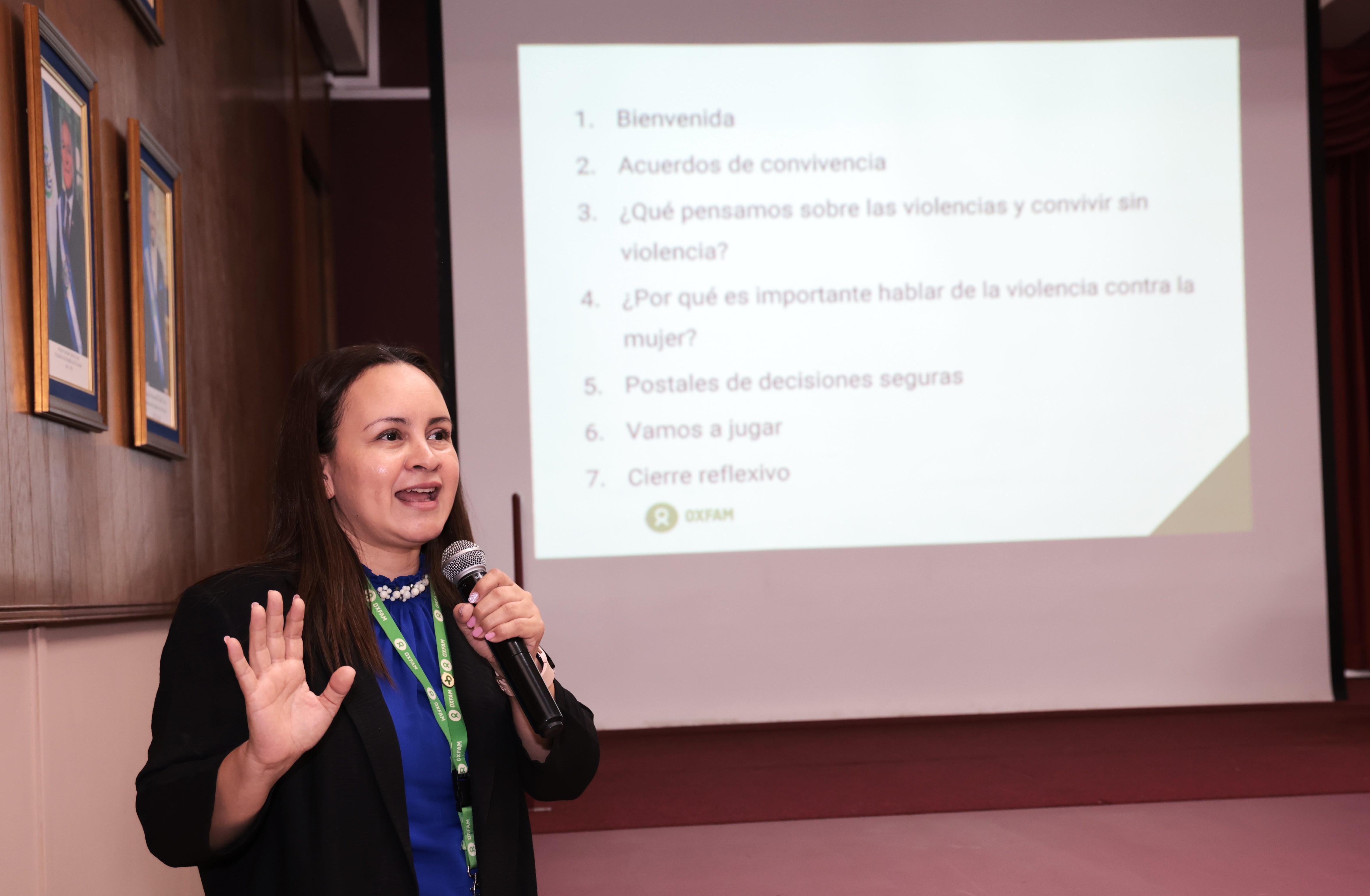 La actividad inició con el conversatorio “Aprender, respetar y convivir: el compromiso de la juventud frente a la violencia”, a cargo de la licenciada Teresa Arévalo, coordinadora del Programa de Derechos de las Mujeres implementado por OXFAM.