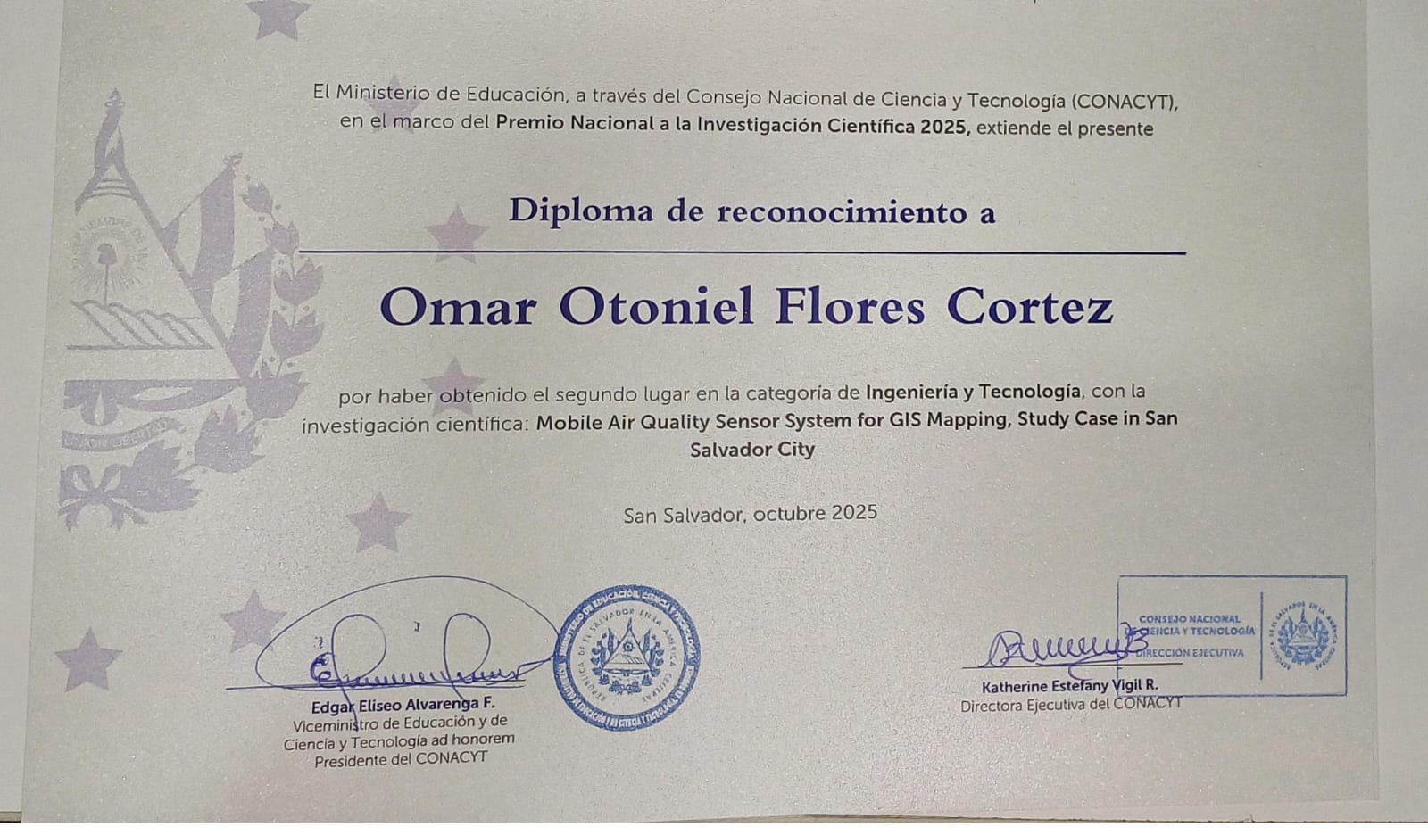 Asimismo, el Ing. Omar Otoniel Flores obtuvo el Segundo Lugar en la categoría Ingeniería y Tecnología con el proyecto “Mobile Air Quality Sensor System for GIS Mapping, Study Case in San Salvador City”, proyecto en conjunto con la Universidad de El Salvador, UES. Un doble logro que reafirma el compromiso de la UTEC con la investigación y la transformación educativa en El Salvador.
