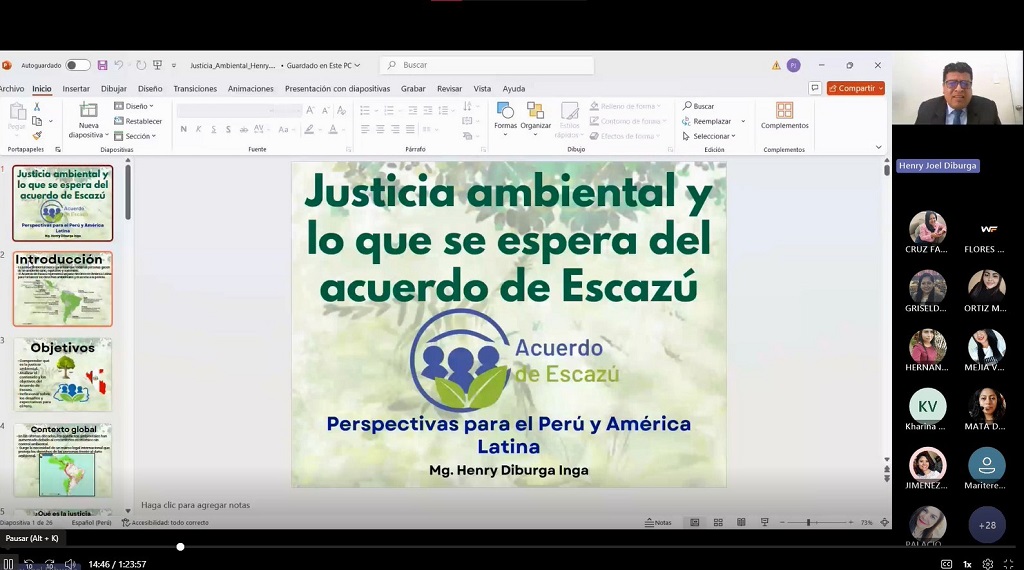 Asimismo, se llevó a cabo el webinario “Justicia ambiental y avances del Acuerdo de Escazú”, impartido por el doctor Henry Diburga, secretario técnico de la Comisión de Gestión Ambiental del Perú, quien compartió avances y desafíos regionales en materia de derechos ambientales.
